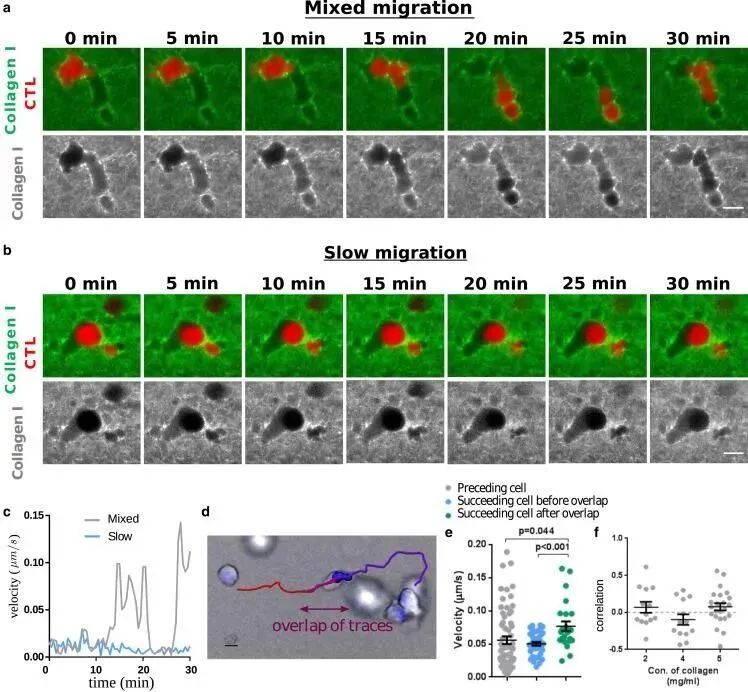 接下来,研究人员又详细探讨了CTL如何在胶原蛋白基质中移。他们对胶原蛋白进行了荧光染色,并使用光片显微镜观察了CTL的运动。